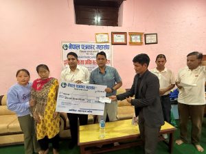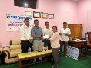 म्याग्दी । नेपाल पत्रकार महासंघ म्याग्दी शाखाले जिल्लामा क्रियाशील पत्रकारहरूको सुरक्षाका लागि दश लाख रुपैयाँ बराबरको दुर्घटना बीमा हस्तान्तरण गरेको छ । विश्व प्रेस स्वतन्त्रता दिवसको अवसरमा शनिबार शाखामा आयोजित कार्यक्रममा जिल्लाका क्रियाशिल २१ जना पत्रकारको दुर्घटना बिमा तथा आर्थिक सहयोग गरिएको हो । नेपाल पत्रकार महासंघ गण्डकी प्रदेशका उपाध्यक्ष प्रकाश पौडेल, शाखा अध्यक्ष हरिकृष्ण गौतम, संस्थापक अध्यक्ष धनश्याक खड्काले पत्रकारलाई दुर्घटना बिमा हस्तान्तरण गरेका थिए ।